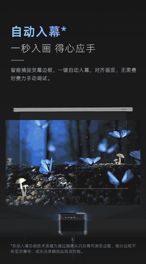自动入幕功能可以智能捕捉荧幕边框,一键入幕,画面自动对齐 ,不需要手动再次调节。大大降低使用过程中动手频率,提升观影幸福感。