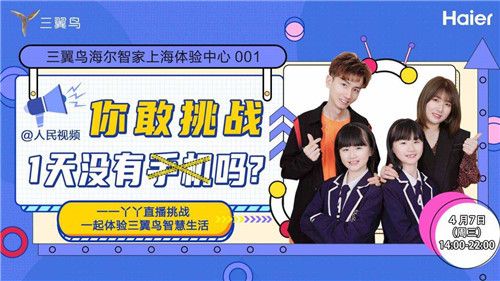 调查结果公布当天,人民视频再次发起了“你敢挑战1天没有手机吗”的活动,在微博上迅速引起科技、高校、母婴、媒体、生活等不同圈层网友的关注和讨论。经过报名,抖音网红一一丫丫于4月7日下午2点来到了三翼鸟海尔智家上海体验中心001开启挑战,并在抖音、人民视频APP、人民网、微博、今日头条、海尔智家APP六大平台同步开启直播。