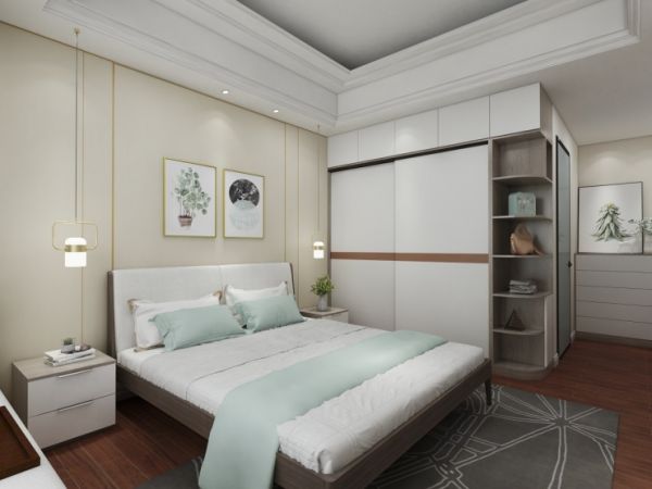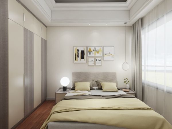 次卧只是在整体的暖色调中融入了少量的浅灰色,衣柜到顶,储物强大,视觉上显得从容高端。设计独特的床头墙精巧细致,清雅的装饰壁画点缀了大面积白色底调的背景墙,处处“小心机”的细节设计,活泼又富有灵气,这就是百强家居极简设计的高级,全新赋予了生活家具更高层次的美学定义。