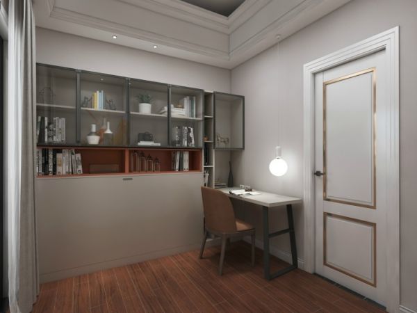 书房则一改之前的温和气质,大胆的采用深色的木质地板和工整的木质书柜,营造出沉稳内敛的风格,虽然只有简约的书桌和灯饰,仍然气场十足。最能展现百强全案设计简而不凡的生活态度的,是在这质朴的书柜下,恰到好处的设计了一张可以折叠的床。小小的书房暗藏玄机,明面上空间灵活,实则巧妙布局,紧凑实用。