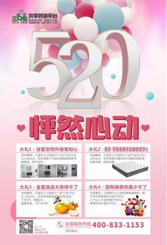 三只兔520推出怦然心动装修活动,联合知名床垫品牌--慕思床垫共同推出“下定装修送慕思•思丽德赛系列床垫”、“下定升级卫浴空间”主题促销活动,让怦然心动的情侣们有好床垫,感受舒适无限;让情侣们有升级的卫生空间放松自我,更好的诠释520怦然心动主题促销活动。