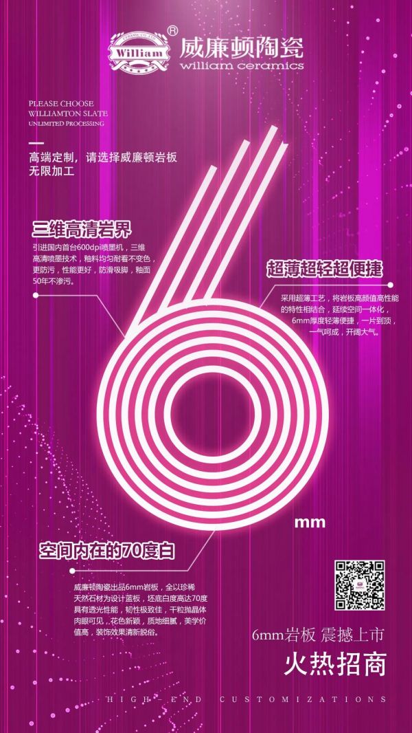 高端定制,请选择威廉顿岩板。威廉顿【6mm岩板】满足你对高品质、个性化家居生活的一切想象,在即将到来的2021年春季佛山陶博会上,威廉顿【6mm岩板】将正式和大家见面,敬请期待。