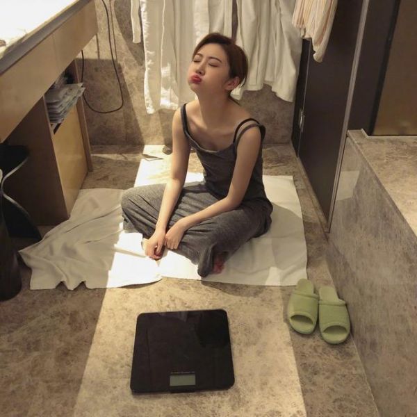 卫生间看起来也算整齐,还做了干湿分离的设计。浴缸的材质和地面、墙面保持一致,整体效果也更加统一。洗漱台就在浴缸的对面,下面还配置了一个化妆凳,这个布置倒是很贴心,洗漱完就直接可以化妆了。不知道她是不是在为电子秤上的数字所烦恼,看起来倒是很可爱。