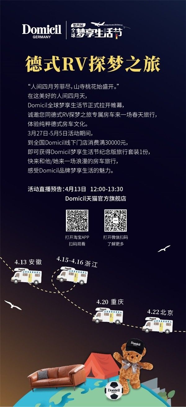 4月13日开始,Domicil全球梦享生活节开启第一站安徽站,解锁白墙青瓦间的德式RV探梦之旅,浙江、重庆站、北京站陆续进行中,梦享生活,即刻启程……