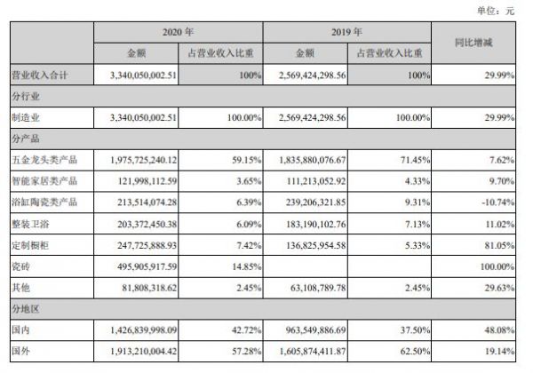 从分产品来看,五金龙头类产品营收为19.76亿元,同比增长7.62%,占营收比重为59.15%;智能家居类产品营收为1.22亿元,同比增长9.7%,占营收比重为3.65%;浴缸陶瓷类产品营收为2.14亿元,同比减少10.74%,占营收比重为6.39%;整装卫浴营收为2.03亿元,同比增长11.02%,占营收比重为6.09%。定制橱柜和瓷砖营收同比有较大幅度增长,分别同比增长81.05%、100%。