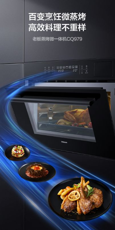 另一款战略单品蒸烤微一体机CQ979则专为繁忙的上班族而来。它通过搭载老板电器独特的澎湃大蒸汽系统、多段组合烹饪模式、加湿烤功能,五档微波技术,为用户带来高效、健康的烹饪新体验。其中,老板蒸烤微一体机CQ979通过整合大功率蒸烤组合加热技术、AI蒸汽精控技术,从而赋予产品预热速度更快、穿透力更强和蒸汽更大的核心优势。营养蒸能让蔬菜、海鲜鱼类、蛋等食材保留天然营养及口感,高温蒸能快速蒸透蒸只鸡鸭,脱脂减盐更容易入味,满足当下消费者对健康饮食的追求。