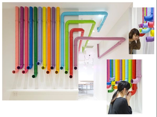 在佛山国际会议展览中心展馆,我们主要是结合展会现场人流与产品的特色,将装置主题设计为“听说”,主要是利用管型建材创作出人人互动的彩色“话筒”,现场人声鼎沸,大家能在这么有趣的装置里面交流、对话,希望可以吸引更多的观展者来打卡体验。