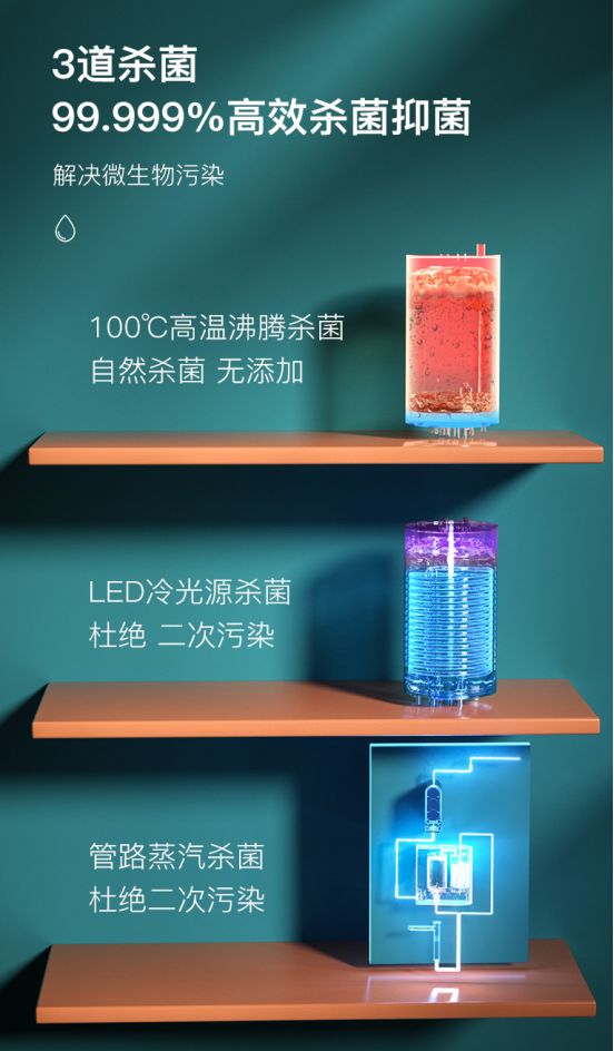 净小新的过滤采用了目前饮用水水处理中的最高精度0.0001微米的反渗透技术,可以过滤小分子、离子等水中所有有害物质。过滤之后还有3道杀菌环节,第一道100°高温杀菌既实现了自然无添加的杀菌,又满足了我们对温开水的需求,涉水管路水箱也均为食品级不锈钢,不会产生塑料异味。