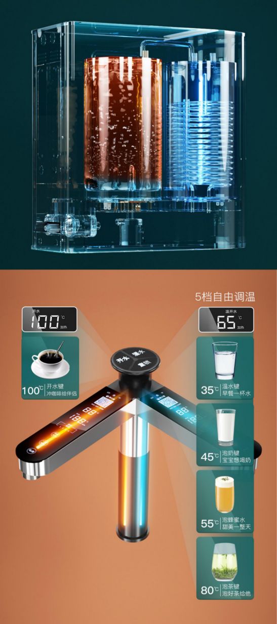 中国人习惯喝热水,即便装了净水器也是烧开后再饮用,一方面是源于习惯,另一方面也是对生水安全方面的顾虑,净小新采用了专利热交换技术,创新结构设计,实现了开水快速降温,开水温水双出水,同时温水可以5档自由调温,满足全家人不同的饮水所需,一键即饮,不等待。白开水性质温和更容易被身体吸收。并且喝白开水更解渴,还能养护肠胃。