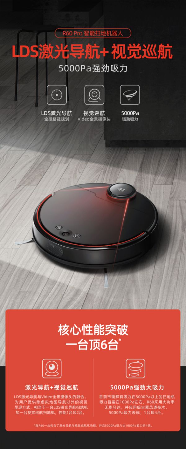小狗R60 Pro采用LDS激光导航、video全景摄像头和超声波传感器,激光雷达单次扫描半径8米,扫描一次即可完成本地地图存储,实现移动拍摄与录像,不仅可探测深色、透明玻璃等材质的障碍物,让清洁更加顺畅,还能为家中安防助力。R60 Pro采用掌上虚拟墙,设备支持APP远程操控,可设置多达10个定点的多边形不规则区域进行分区清扫,哪怕在复杂多变的家庭环境中也能做到灵活、精准的清洁。
