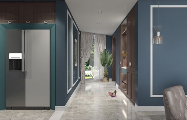 步入玄关,仿佛步入电影《公民凯恩》,作为座上宾的你缓缓走社会名流和富豪聚会的城堡。表面入墙与空间浑然一体,两边高和中间低的柜体设计好似训练有素、进退得宜的“管家”,迎你入门的同时接过你的外套和随身携带的物品,引导你入场。