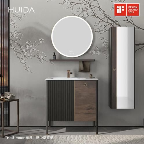 惠达“Half-moon半月”新中浴室柜,设计灵感来源于苏轼的《水调歌头·明月几时有》中的“月有阴晴圆缺”,指出事物形态不是一成不变的,半月同样有它独特的中式意境。该产品将中式风格与现代元素相融合,创造一种全新的中式家具感受,不对称的门板分割打破了中式家具原有的对称美学,保留的是中式气质高雅的胡桃木纹,“半月拉手”是作品的点睛之笔,半镂空半镶嵌的中式传统工艺,搭配现代极简的外观形式,金色拉手精巧雅致,配合天圆地方的灯光镜及金属线条的点缀,产品从颜色、材质、细节等各方面折射出一款独特韵味的中高档新中式家具,该产品的设计和获奖,体现了中国民族企业的典范作用。