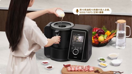 以TOKIT 厨几AI多功能料理机为例,它以8吋大尺寸触控屏搭配环形旋钮,改变了同类产品复杂的交互方式,让产品在信息显示更直观的同时,简化了操作步骤。内置的人体传感器,在有人接近时会自动唤醒并开启屏幕,用户还可以根据自己的需求设定个性化的开合角度。内置的光感自适应系统,则可以自动调节屏幕亮度,让眼睛永远处于最舒服的状态。