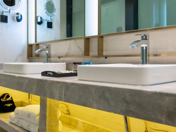 洗手台的右手边有个180度旋转的LED化妆镜,两款颜色不同的玻璃杯,洗漱用品的包装上也有着希岸专有的细致感。精益求精,酒店在细节上的设计已经到了一种极致。