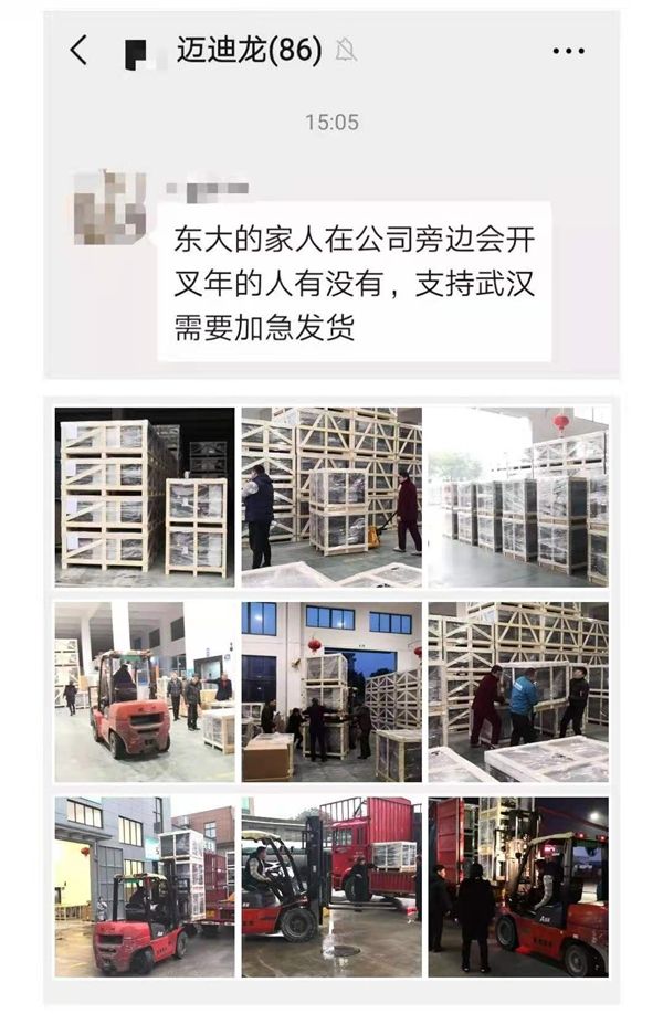 2020年1月24日下午,在接到了武汉方面火神山医院项目的加急订单电话后,宁波迈迪龙当即成立设备供应应对小组,邵安春先生亲自担任组长,并第一时间召集留在当地的10余名中高层管理人员赶回公司投入工作。这批工作人员紧急打包输送,抢在当晚23点前将40余套新风设备发往目的地。1月26日,再次接到电话,要求继续提供新风设备。28日,宁波迈迪龙再次向火神山医院输送48套进行微调后的新风设备。