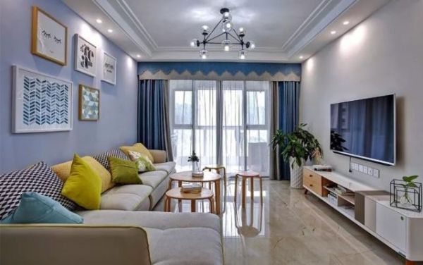 客厅摆放的是一套布艺沙发,配上了几个彩色抱枕,显得很有活力和朝气,客厅的茶几是实木的,原木色调,小而精致,又不占位置,沙发墙面使用淡蓝色装饰,清新淡雅。