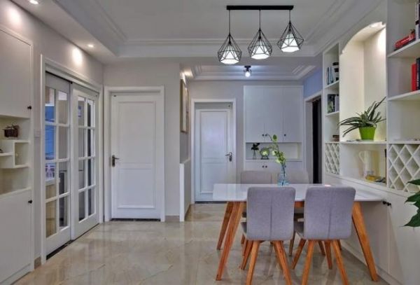 餐厅使用的是一张长方形餐桌,采用白色与原木色搭配,清新自然,令人感到很清爽,墙面安装了一个酒柜与餐边柜的组合,简洁大方漂亮实用。