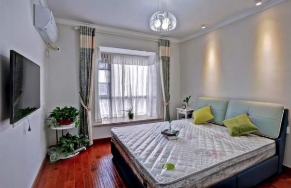 主卧布置简单温馨,清新的窗帘加上植物的点缀,整个空间宁静而舒适,地板铺的是实木地板,可以吸引空气中的湿气,对人体有益。