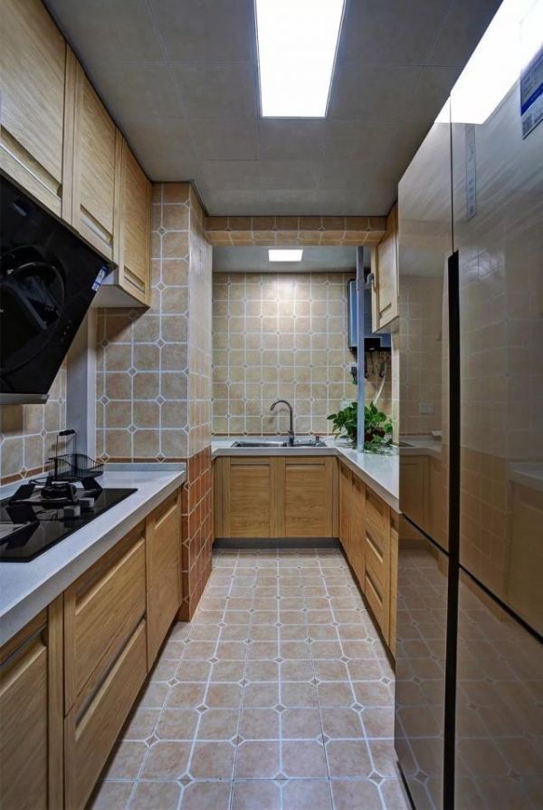 厨房采用U型布局,充分利用空间,将墙面柜子装得满满的,便于收纳物品,厨房安装的是整体橱柜,搭配石英石台面,门板安装的是木纹装饰面板,色调温馨自然。