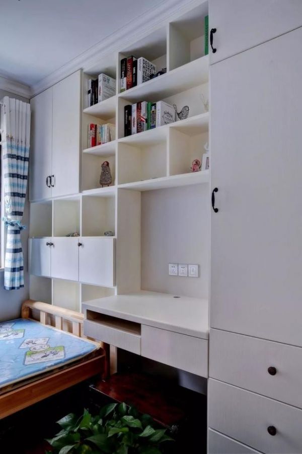 次卧虽然空间小,但是空间利用很高,一张实木床铺,自然温馨,床尾墙面安装了一个组合柜,书桌与书架的搭配,整体简洁实用。