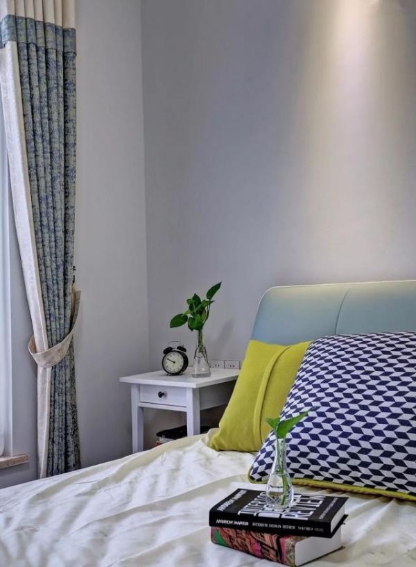 卧室床头搭配的是白色床头柜,简洁明亮,清新舒适。