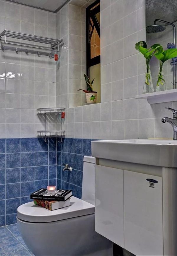 卫生间墙面采用两种不同颜色的瓷砖铺贴,尽显空间层次感,下半部分蓝色瓷砖与白色家具组合在一块,让空间感显得清新自然。
