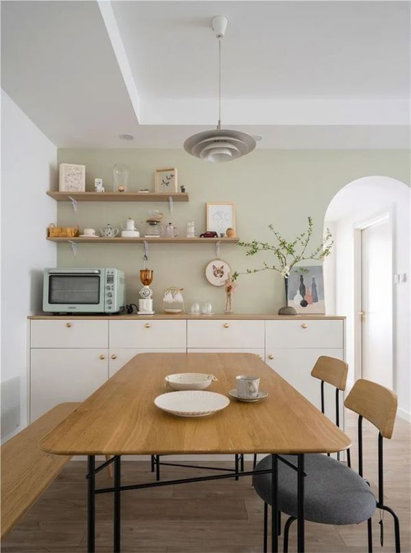 灰调的浅绿色,是令人愉悦的,点缀在嫩芽上的边角绿。一抹浅灰绿的背景墙使整个空间都充满安静的气息,融入崇尚自然本源的原木色系,加上简洁线条的巧妙勾勒,一个充满温情的北欧空间就此形成。