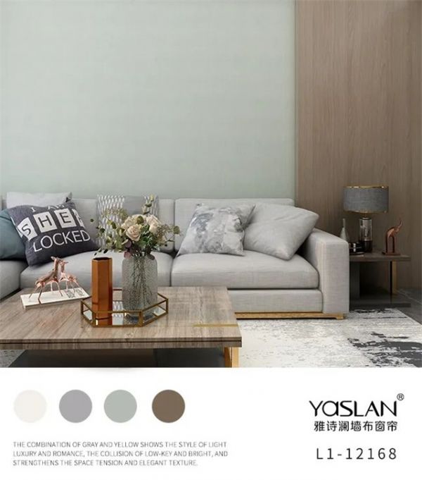 雅诗澜墙布运用明度较低的浅灰绿,以视觉的洗礼,给人温婉平和的典雅之感,舒缓又轻快。金属色的家具,提亮了整体空间,和浅灰绿的颜色在一起,呈现出自然纯粹之美。