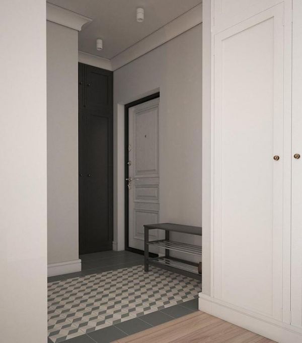 玄关通往客厅空间的转角处设计了一组嵌入式衣柜,增加室内的收纳空间,卧室隔墙一侧则安装了一面全身镜,方便女主人换衣时使用。