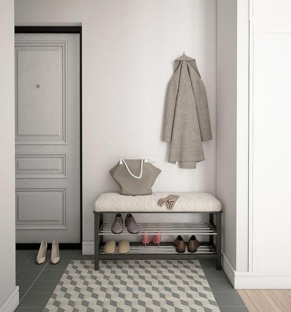 入户门左侧角落摆放了一张舒适的换鞋凳,方便女主人进出门时坐着换鞋。换鞋凳下方的两层鞋架可以用来收纳拖鞋和进门换下的鞋子以及常穿的鞋子。换鞋凳上方的墙面上设有简易挂钩,用来收纳进门换下的外套、围巾等。
