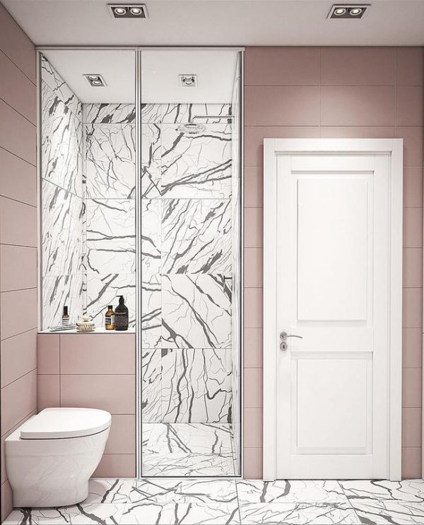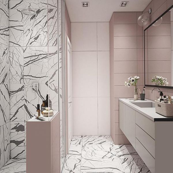 卫生间配色采用了柔和的粉色搭配白色,给人一种温馨浪漫又不失精致的感觉,时尚又大气。卫生间右侧借玄关空间隔出了一个单独的淋浴间,让卫生间做到干湿分离。淋浴间隔断采用透明玻璃,右侧设计了半墙隔断,半墙上方的台面可以收纳洗浴用品,既好看又实用。淋浴间内的墙砖和地砖都采用了同一种材质瓷砖通铺,非常大气。