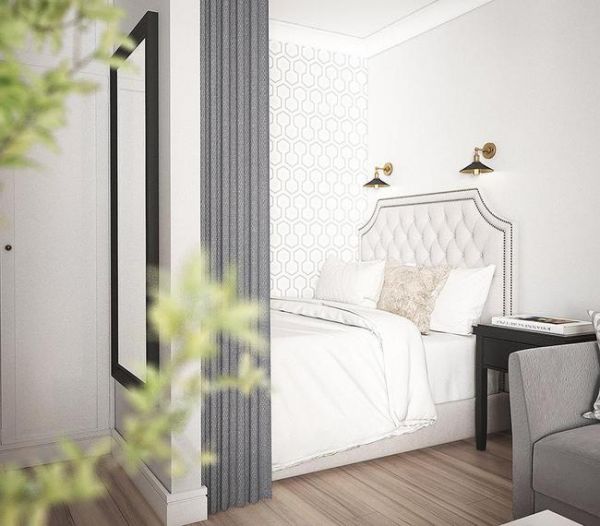 卧室与客厅之间设计了帘子作为隔断,有客人来访时,拉上帘子就可以保证卧室隐私,一个人在家时,拉开则能保障卧室的采光和通风。卧室床头背景墙上只安装了两盏壁灯,简洁又实用。卧室和沙发之间摆放了一张黑色的床头柜,既可以收纳,又可以作为空间的隔断。