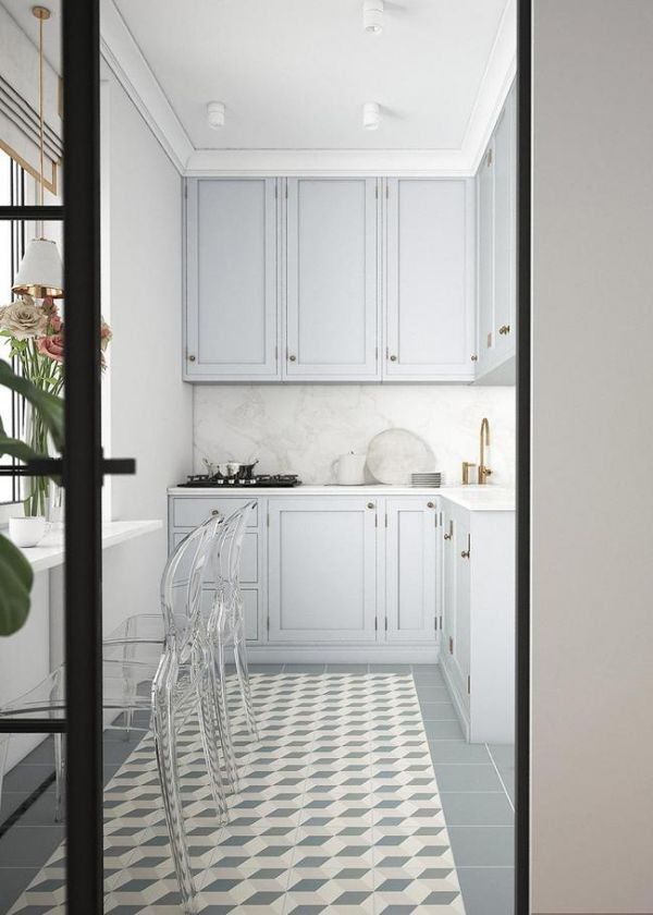 厨房与客厅之间设计了玻璃折叠门,做饭时关上门就能隔绝油烟。厨房橱柜L型布局,面积虽然不算大,但是功能齐全。橱柜门整体浅蓝色设计,与白色搭配,给人一种清新的感觉。厨房中设计了嵌入式的电器高柜,嵌入了冰箱、烤箱等厨房大家电,方便业主使用。