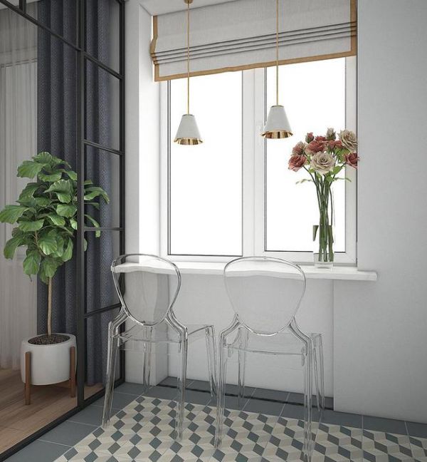 为了最大限度的利用空间,设计师在厨房的窗台处做了一块台板,搭配两张餐椅,就形成了一个小餐厅,满足业主在家就餐的需求。台面上方则安装了两盏精致大气的线性吊灯,可以给餐厅提供照明。两张透明的餐椅既能增加空间的现代感和设计感,也能在视觉上让空间变得更大,让厨房空间不会显得压抑。