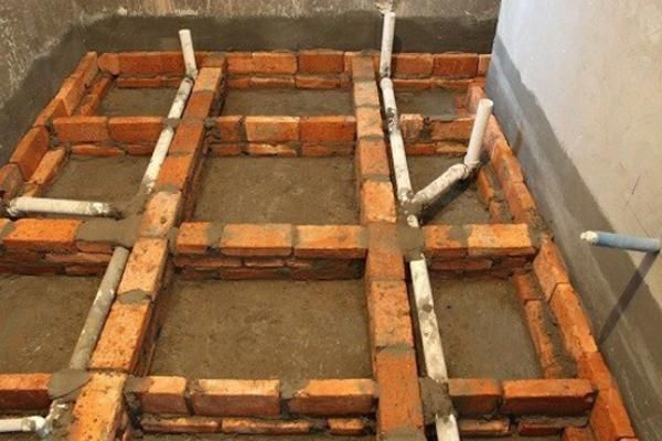 紧接着再用普通的砖头做个架空,这一步至关重要,通过隔断架空,可使平面分成均匀的小格子,这样不仅可以防止卫生间开裂漏水,甚至还能有效保护管道,延长管道的使用寿命。
