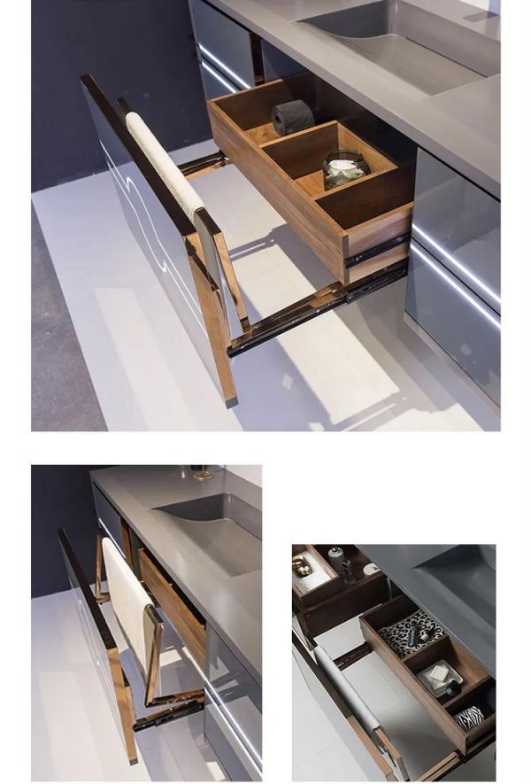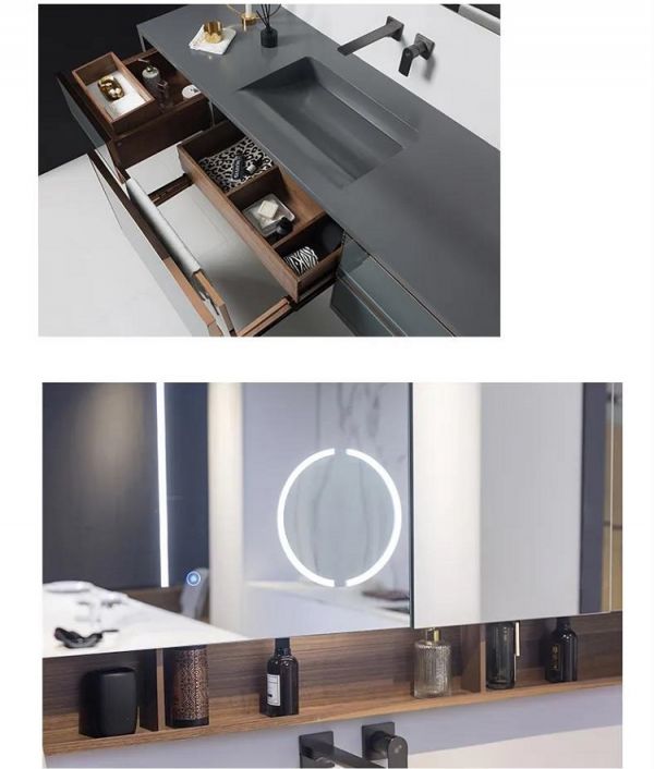 浴室柜体采用“木材中的贵族”胡桃木材质,自然健康;内置毛巾杆,舒适便捷存取;灰色石英砂一体盆除了耐刮、耐划,同时还具有自然消音的作用,还原宁静舒适生活,可以说是一款兼顾美观性、实用性、环保性和创新性的卫浴美学产品。
