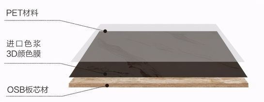 PET柜门板表层材料由两层构成,上层采用PET材料(表面透明部分),下层为进口色浆制作而成的3D颜色膜材料,基材为经过国家环保认证的高环保型OSB板。强度及硬度高,摩擦系数稳定。