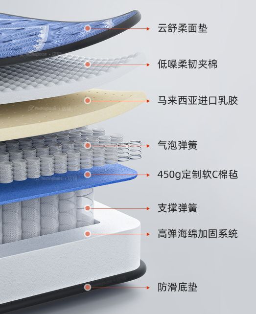 外表由云舒柔面垫、防滑底垫及高弹海绵加固系统包裹,精工细作,纱线密集而均匀,不易抽丝变形,经久耐用。层层精心配比,多层空气微循环,更好地释放人体代谢的水蒸气,保持干爽,防潮防螨虫。