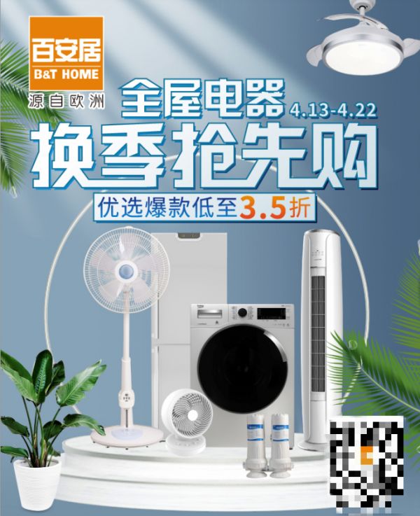 此次全屋电器换季抢先购活动,精选了多款爆品电器,其中更有优选爆款低至3.5折,跨品类购买电器还可以享受满3000元立减500元的满减优惠。百安居为消费者精选格力空气循环风扇、飞利浦遥控风扇灯和小禾智能光线感应灭蚊器等家电特价出售,为消费者在换季之际提供更智能、更便捷的安居换季攻略。