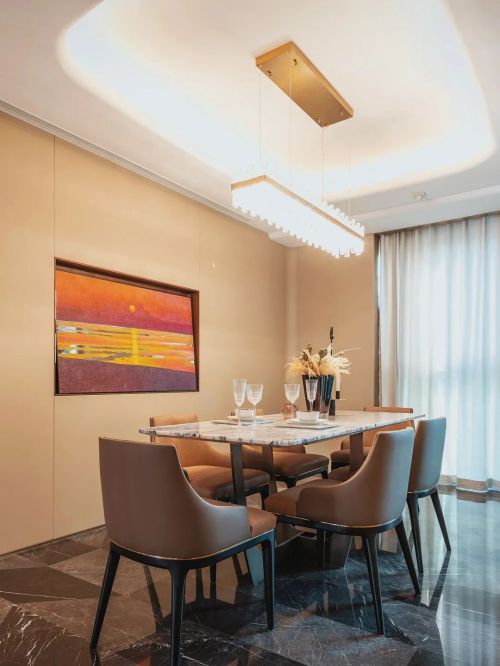 来到餐厅,首先映入眼帘的是那极具19世纪印象派画风的绘画,仔细一看又并非悬挂在米色的墙面,一丝秒感浮于心上。敞亮的灯光照在精致摆放酒杯的大理石餐桌上,下面又摆着整齐的设计巧好的餐椅,一起散发着精致的高雅气质。