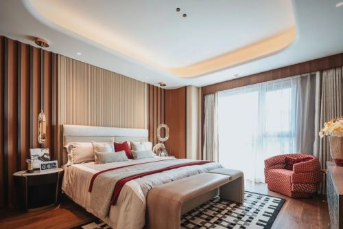 愉悦地来到卧室,绚丽的灯、精挑细选的石材,摩登感十足,粗细不一的墙壁装饰,连着收起来的窗帘,再连结着炫目的白日光,用不同变形的线条组成并营造了简约却又充满设计的唯美画布。床前弯曲得恰到好处的凳子与鲜明的红白格栅的沙发看似突兀,反而更深层次的表现了单一抽象的摩登风格。