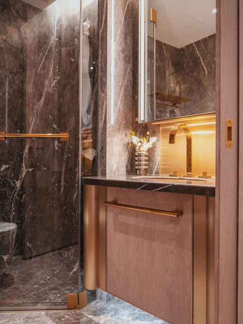 东张西望,感叹于精美设计,最后行至洗手间,在饱和度低的色系中,用摩登金包涂的水阀给人一种温暖的感觉,不规则的石纹与那立体紧密的木纹为简单的空间赋予质感,整体虽简约却又设计精心,看似单调实则精美。