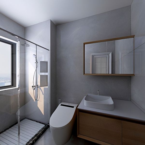 卫生间其实最后没有做成这种样子,因为自己想的是一个玻璃门干湿分离,不过当设计效果出来后,这个设计看上去释然不错,但实际感受上有些紧凑,最后还是听从设计师的建议。