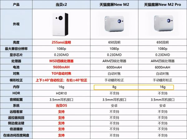 老规矩,先上产品参数对比表,红色部分为优势。今天这三款产品的对比有点惨烈呀,基本上当贝c2垄断了所有优势,但是本着尊重每一款投影的原则,还是详细给大家做一波测评!