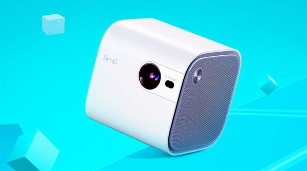 天猫魔屏New M2 Pro正方形外观,白色机身上有个天猫家的图案LOGO,配色上相比于当贝c2稍有些单调。