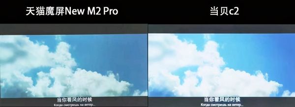 右边的当贝c2明显画面更加纯净通透,虽然是蓝天白云,但是天猫魔屏New M2 Pro居然显示出一种阴天的感觉,画面昏暗,无论是色彩饱和度还是对比度,亦或是明暗程度极大的落后于当贝c2。