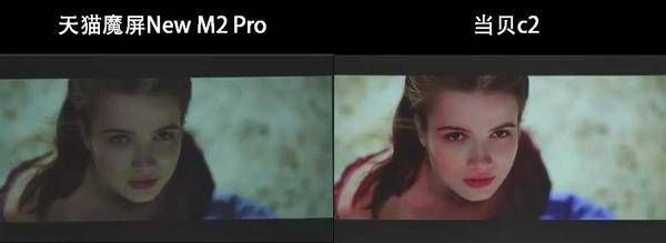 投影仪国际标准亮度单位是ANSI流明,投影机的亮度越高,投射到屏幕上的相同尺寸的图像越明亮,图像也就越清晰。这两款产品亮度参数上,当贝c2为255ANSI流明,天猫魔屏为650流明。流明是我们肉眼看到的灯泡亮度,并不代表投射在墙壁上的真实亮度。所以天猫魔屏的亮度标注并不可信。从实际对比图来看,当贝c2里人物画面更加真实,天猫魔屏会更暗。这一轮,还是当贝获胜。