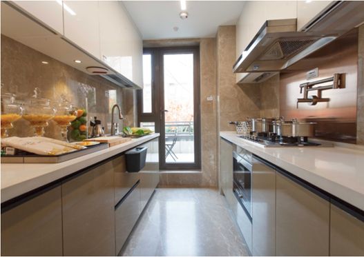 深圳是改革开放以来,青年们最先去逐梦的地方,哪怕是今天北上广深仍旧是全国青年都向往的实现梦想的胜地。超一线城市住宅空间资源紧缺,想扎根生活总是不容易的,即便有很大一部分人只能栖身一个小的房子,也并不影响他们通过有质量的生活收获归属感。柏厨家居和万科·云城的这次合作,充满了对家的温度的思考,看上去仅有咫尺的空间,在科学规划下万物有序,体现了设计者对空间的掌控规划能力。厨房设计双面烤漆门板配合隐形拉手、三星石英石台面大方整洁,L型厨柜的布局尽可能节省空间,把烟机隐藏在吊柜内,保证了烟机一侧的外观整洁统一;配套使用烤漆百叶门,保持热水器吊柜通透性和美观度;厨房五金配有海蒂诗抽屉、拉篮等,增添了整体厨柜的收纳功能,还贴心的预留了单门冰箱位置,让一个五脏俱全的厨房整齐呈现。一日通勤结束到家,一个可以迅速开火高效烹饪简单清洁的厨房,就像是一个贴心的田螺姑娘,帮助主人迅速达成美食的慰藉。一个厨房是家的一隅,而一个家是城市的一隅,哪怕空间再小,有柏厨就有幸福!