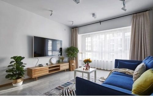如果嫌弃各种电视墙太花俏,可以考虑直接大白墙,清爽简约,而又不想太单调的大白墙,可以考虑向下面这样走极简风。如果觉得大白墙过于素净,也可以根据家里装修风格,客厅背景墙适当涂刷颜色。