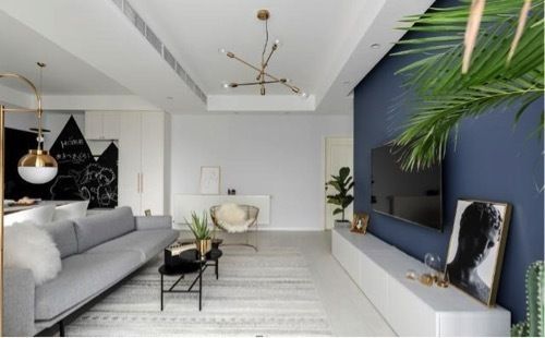 整面墙灰霾蓝刷漆,配合纯白长条电视柜素净,金色饰品灯具画龙点睛。
